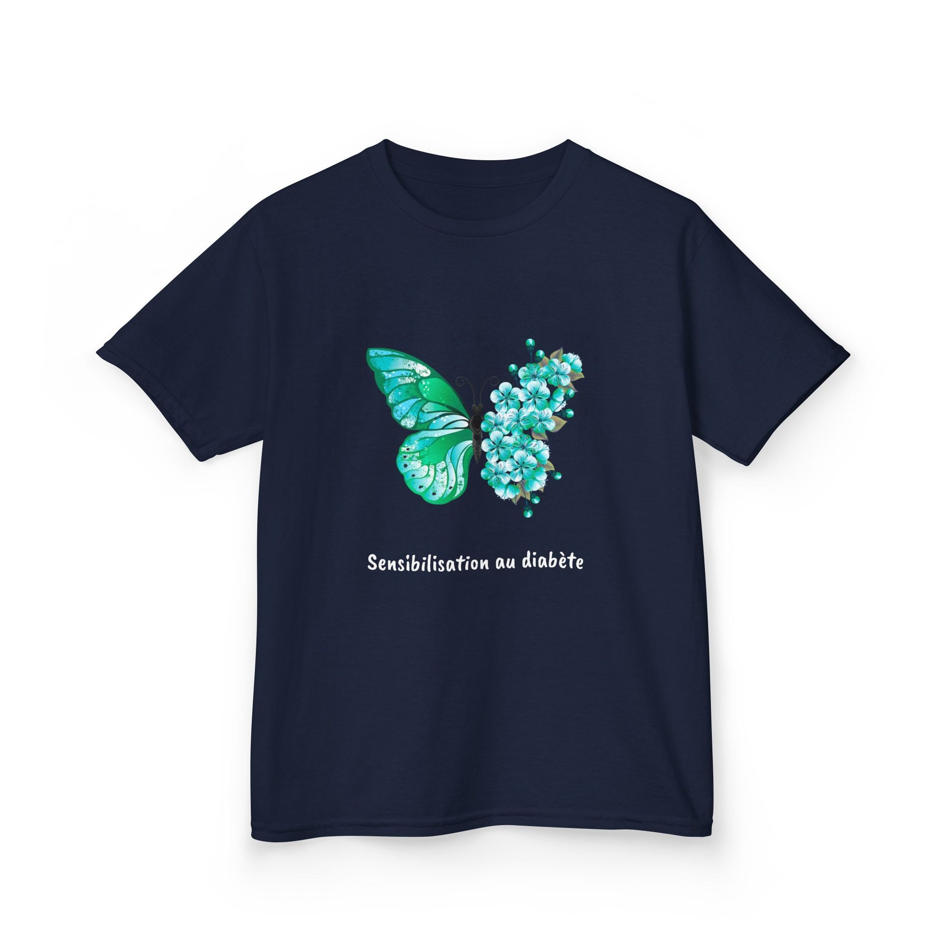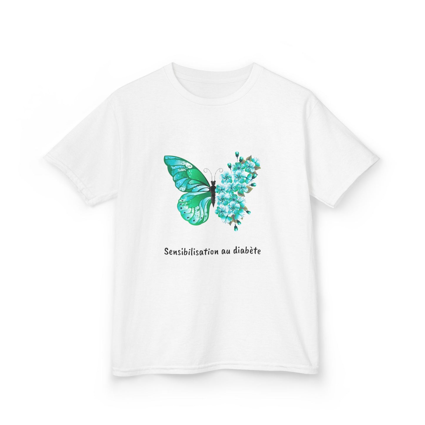 Green Butterfly & Flowers (French) - Kids Tee: Just like a caterpillar transforms into a beautiful butterfly, children living with diabetes display incredible strength, adaptability, and a blossoming spirit. Our "Butterfly & Flowers" tee for kids is a gentle yet powerful symbol of growth, hope, and the vibrant beauty that comes from embracing life's journey. The delicate butterflies represent resilience and transformation, while the cheerful flowers symbolize flourishing and joy. This shirt is a wonderful way to celebrate your child's unique spirit and courage. It’s perfect for little ones who are learning to manage their diabetes, offering a positive visual reminder that they are capable, beautiful, and can absolutely thrive. Ideal for school, play, or simply brightening their day, this tee lets their inner beauty and strength shine through.