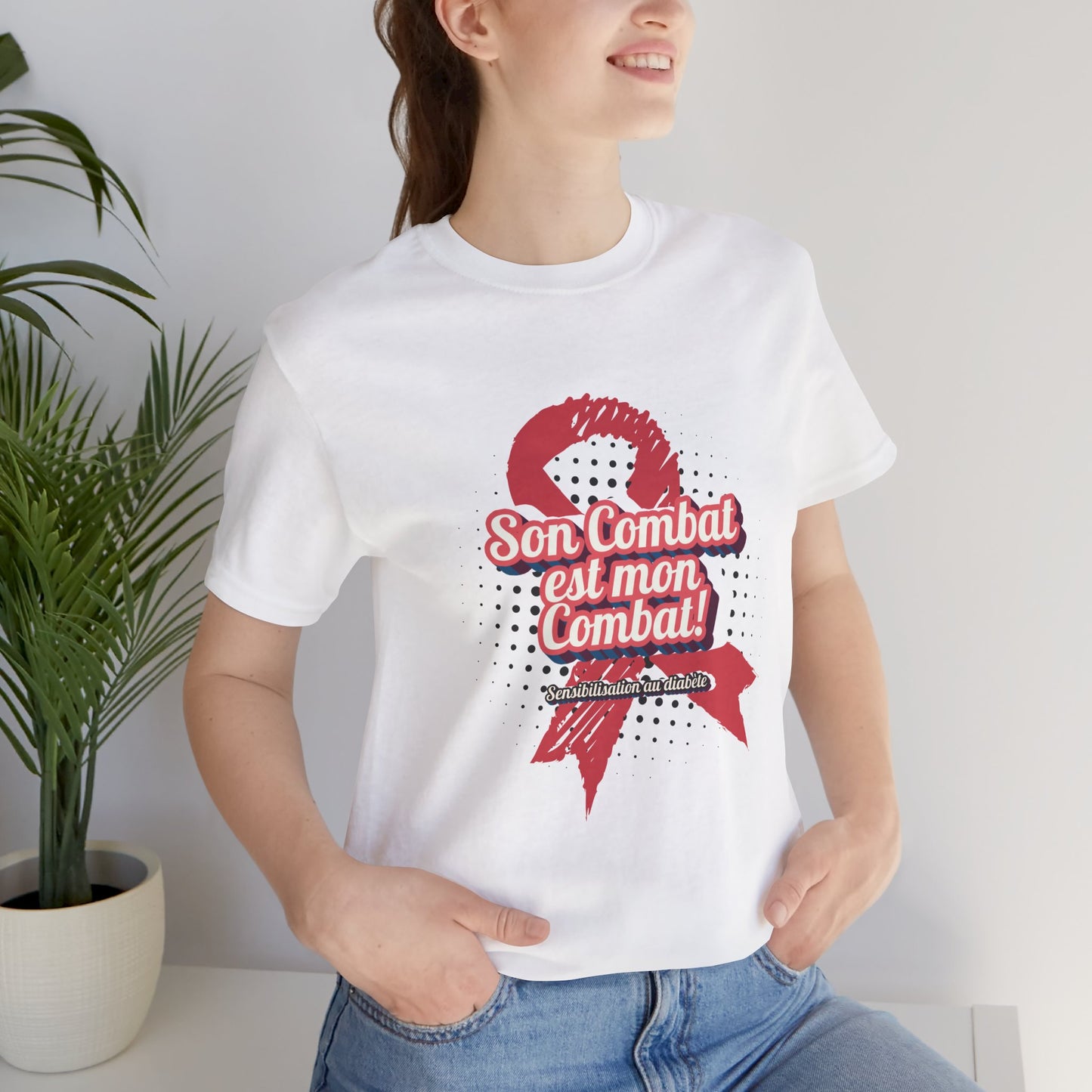 Her Fight is my Fight! (French in Pink) - Unisex Tee: Show your support and raise awareness. When someone you love faces a battle, you're right there with them, every step of the way. This "Son combat est mon combat!" t-shirt is a powerful and heartfelt tribute to that shared journey. Wear it to show your unwavering support for the person in your life who is facing a health challenge, an adversity, or any difficult fight. Made from soft, comfortable, and durable cotton, this unisex tee offers a classic fit that's perfect for everyone. It's more than just a shirt; it's a statement of solidarity, love, and partnership. Wear it to doctor's appointments, charity walks, or just in your daily life to show that his strength is your inspiration and his fight is your fight.