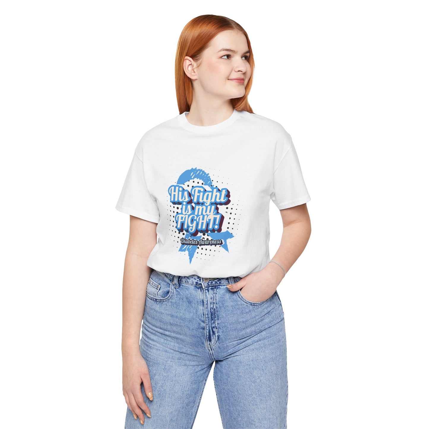His Fight is my Fight! - Unisex Tee: Show your support and raise awareness. When someone you love faces a battle, you're right there with them, every step of the way. This t-shirt is a powerful and heartfelt tribute to that shared journey. Wear it to show your unwavering support for the person in your life who is facing a health challenge, an adversity, or any difficult fight. Made from soft, comfortable, and durable cotton, this unisex tee offers a classic fit that's perfect for everyone. It's more than just a shirt; it's a statement of solidarity, love, and partnership. Wear it to doctor's appointments, charity walks, or just in your daily life to show that his strength is your inspiration and his fight is your fight.