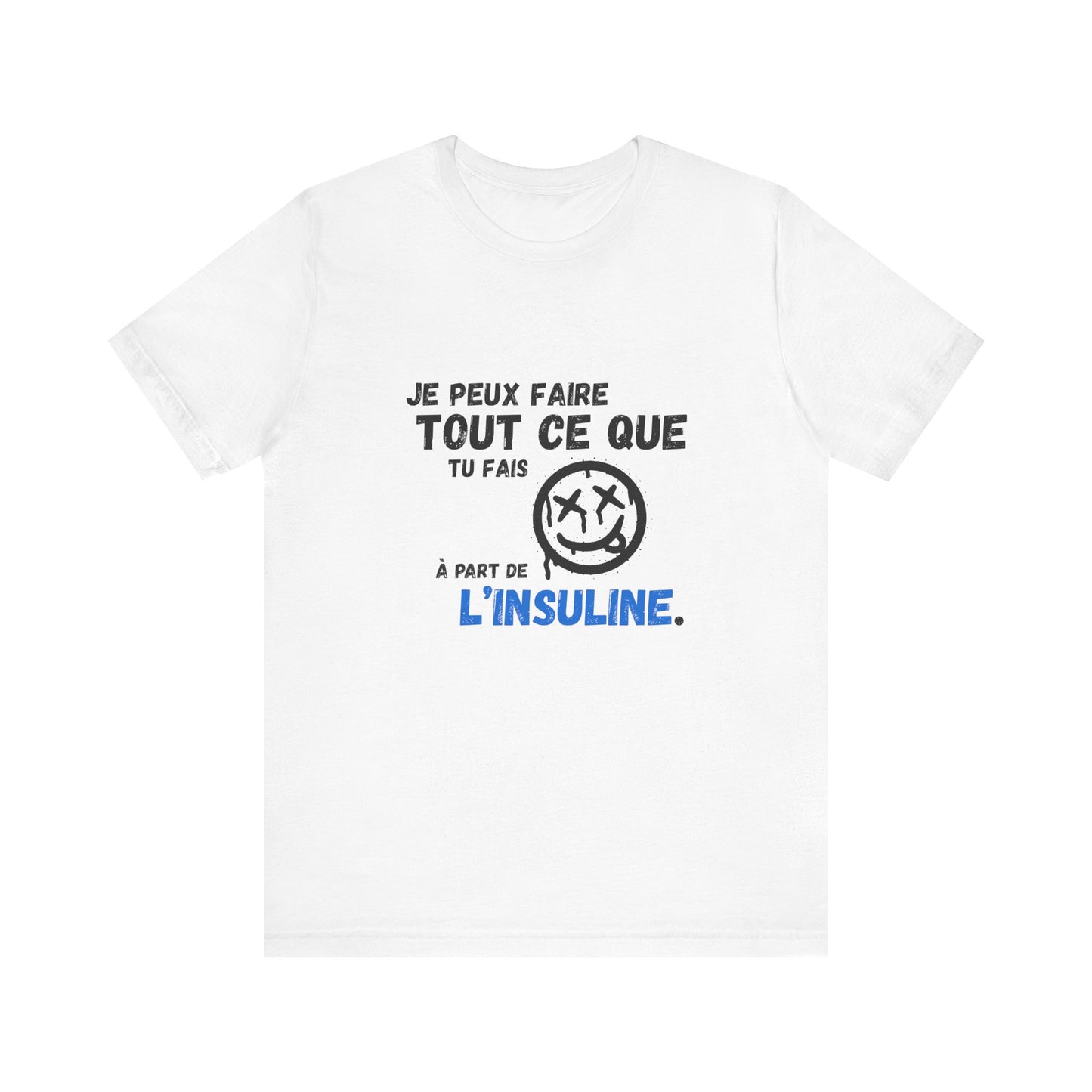I can do anything, except insulin (French) - Unisex Tee: This tee carries a powerful message for those who live with unwavering strength: "Je peux faire tout ce que tu fais à part de l'insuline" ("I can do everything you do except for insulin"). It's a statement of capability, resilience, and the unique reality of life with insulin dependence. Wear your truth and spark important conversations. Made from comfortable, high-quality fabric for everyday wear.