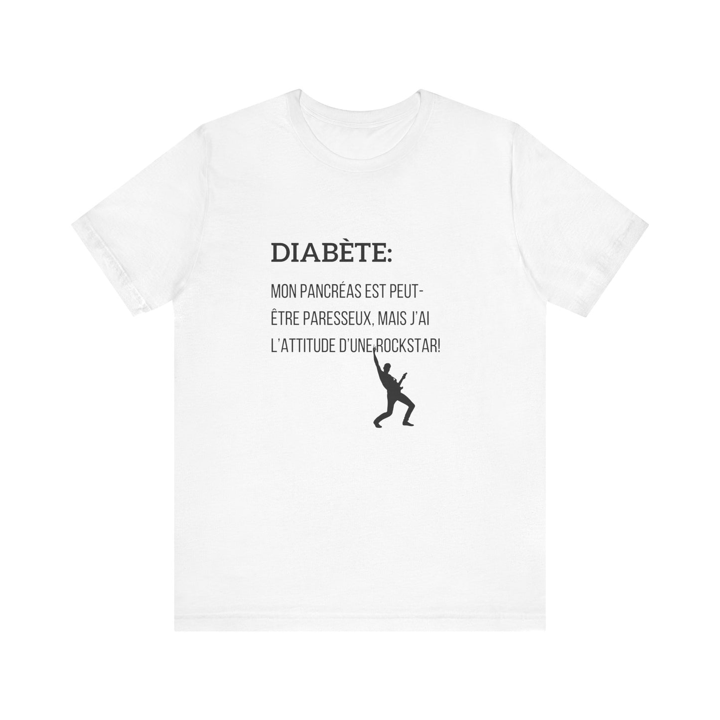Lazy Pancreas, Rockstar Attitude (French) - Unisex Tee: Embrace your journey with a dose of humor and a whole lot of swagger! Our "Lazy Pancreas, Rockstar Attitude" tee is designed for anyone living with diabetes who tackles daily challenges with strength, resilience, and an unshakeable spirit.