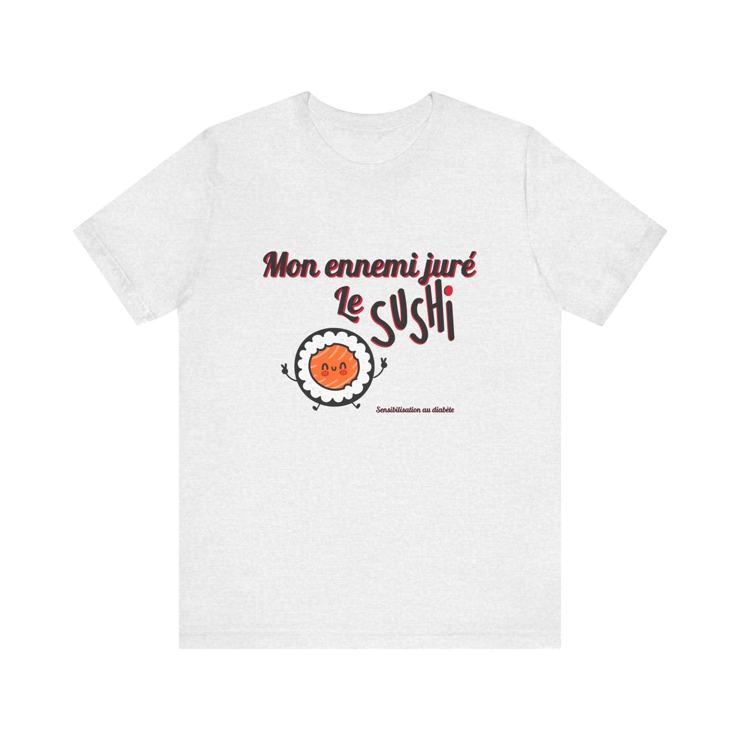 My Arch Nemesis... The Sushi (French) - Unisex Tee: Conquer your cravings (or at least laugh about them!) with our "My Arch Nemesis... The Sushi" Unisex Tee. This fun and relatable tee is perfect for any diabuddy who knows the sweet struggle of managing blood sugar around their favorite foods. Made from soft, comfortable fabric, it's a great conversation starter and a stylish way to wear your diabetes humor.