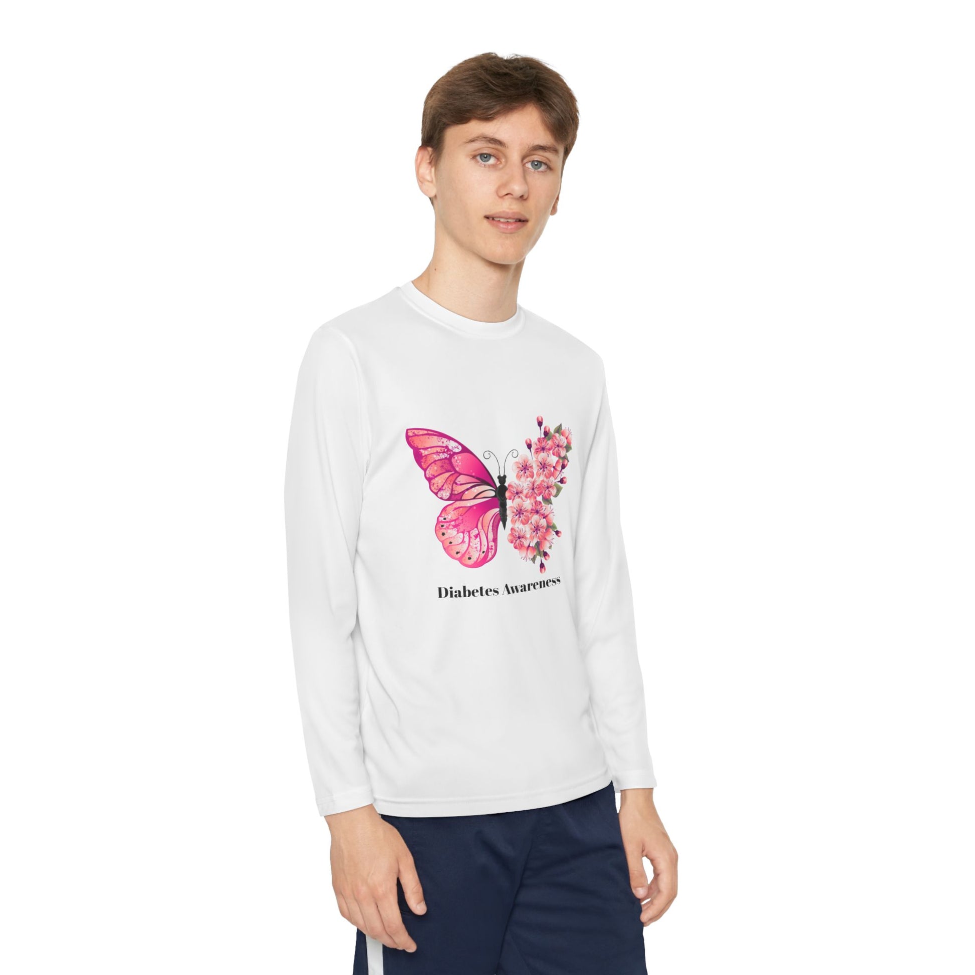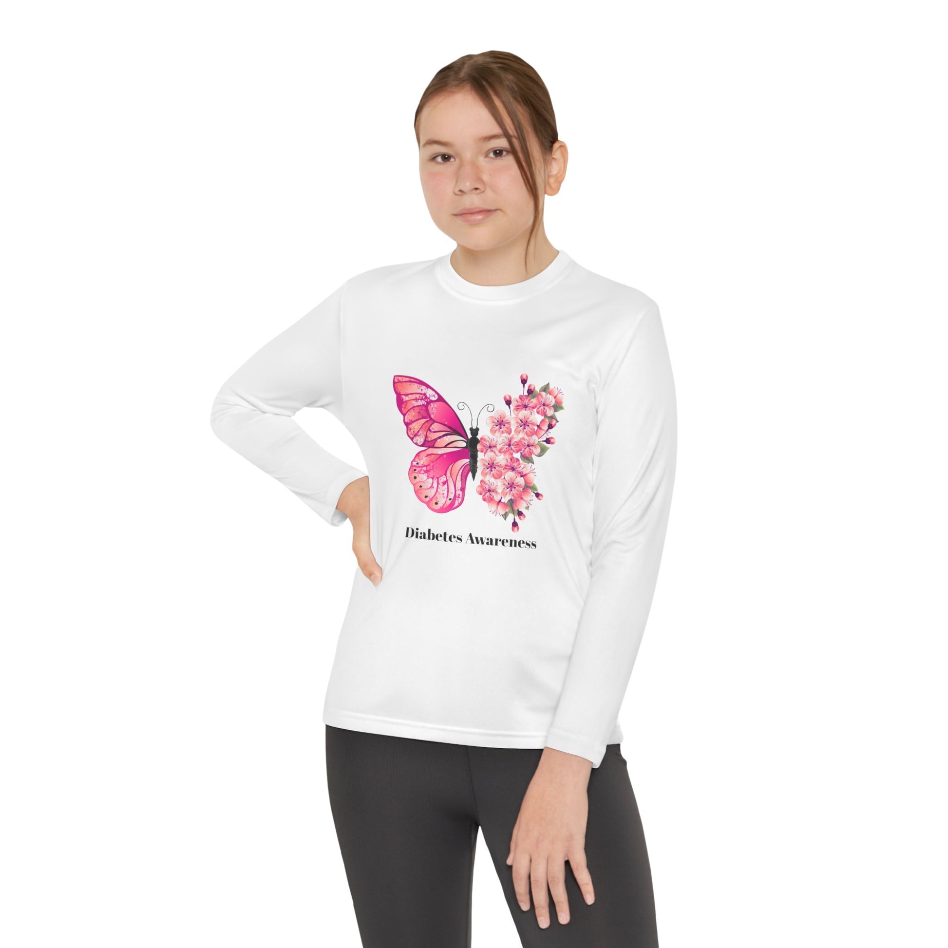 Pink Butterfly & Flowers - Longsleeve Youth Tee: Just like a caterpillar transforms into a beautiful butterfly, children, including those living with diabetes, display incredible strength, adaptability, and a blossoming spirit. Our "Pink Butterfly & Flowers" longsleeve tee for youth is a gentle yet powerful symbol of growth, hope, and the vibrant beauty that comes from embracing life's journey. The delicate pink butterflies represent resilience and transformation, while the cheerful flowers symbolize flourishing and joy. This shirt is a wonderful way to celebrate your child's unique spirit and courage. It’s perfect for young ones who are learning to manage their diabetes, offering a positive visual reminder that they are capable, beautiful, and can absolutely thrive. Ideal for school, play, or simply brightening their day, this tee lets their inner beauty and strength shine through.